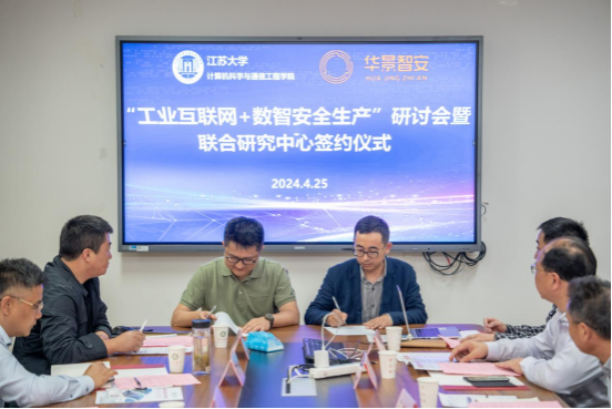 On April 25, 2024, the signing ceremony and seminar for the establishment of the "Industrial Internet + Smart and Safe Production" Joint Research Center, jointly founded by the School of Computer Science and Communication Engineering of Jiangsu University and Sichuan Huajing Zhian Technology Co., Ltd., was held in Room 221 of the School of Computer Science.